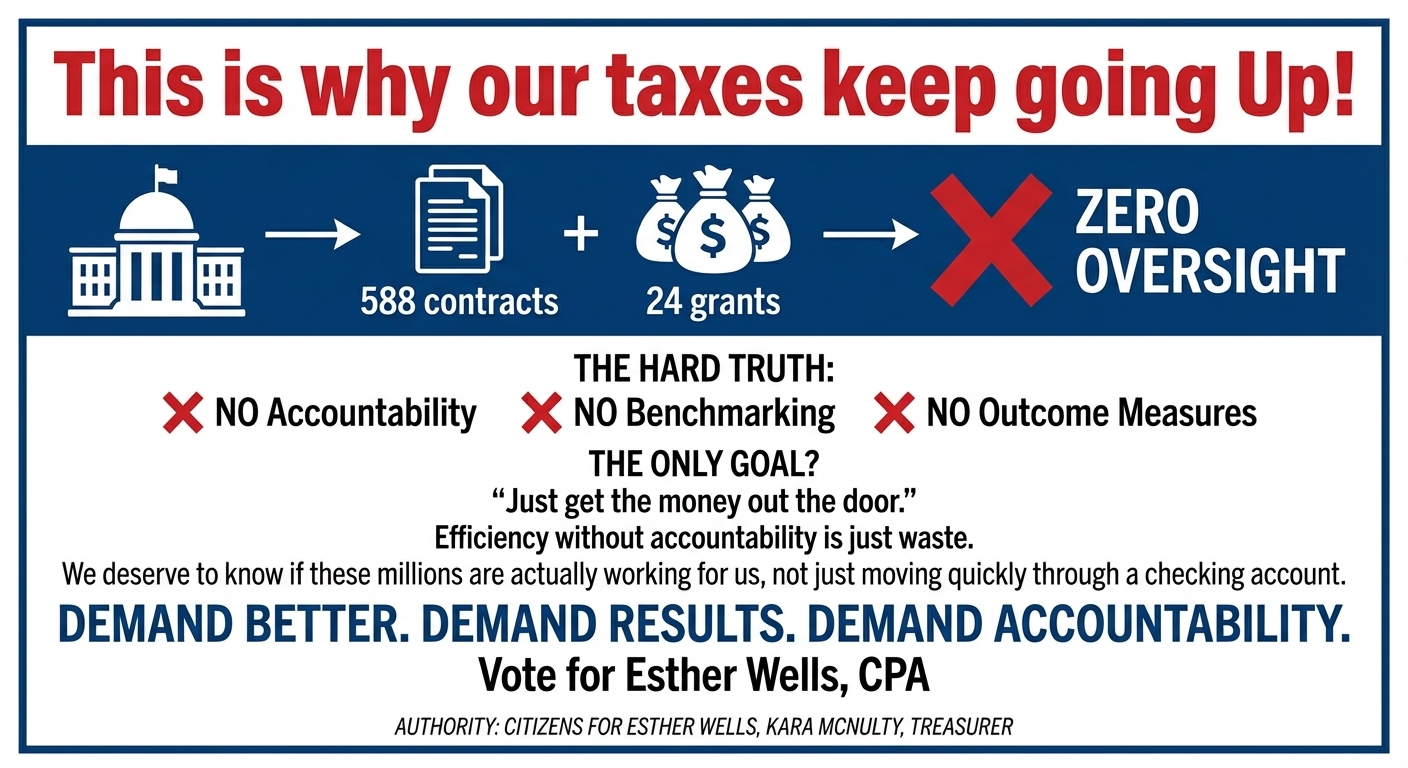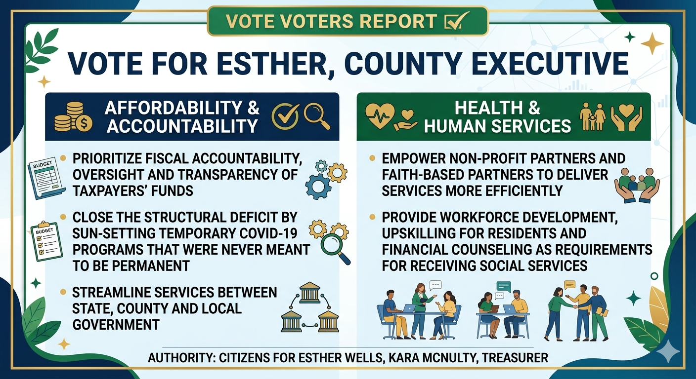Esther Wells will lead with measurable goals, fiscal stewardship, and transparent government—centered on affordability, accountability and private sector growth.
