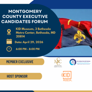 Business-driven County Executive Candidates Forum jointly hosted by the Montgomery County Chamber of Commerce and the Greater Bethesda Chamber of Commerce. The forum will be held on April 29, from 6:00 to 8:00 p.m., at the KID Museum, 3 Bethesda Metro Center, Suite 140, Bethesda, MD 20814.